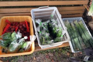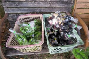 100円:ナス43・青ナス19袋、キュウリ18袋、ピーマン8袋、オクラ7袋、とうがらし6袋・万願寺6袋、ゴーヤ6個、ネギ8束