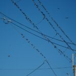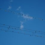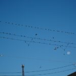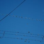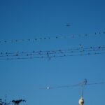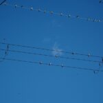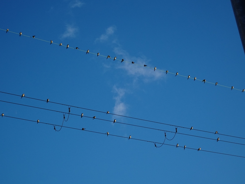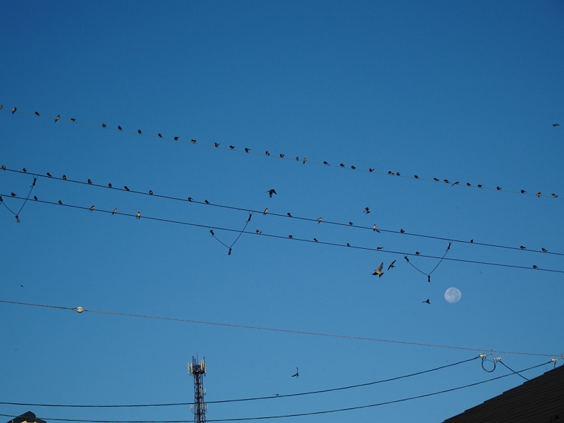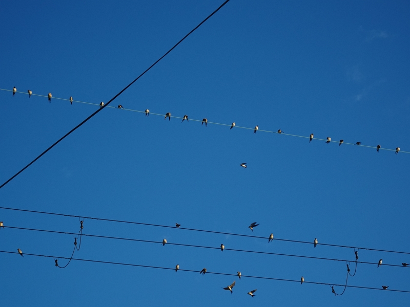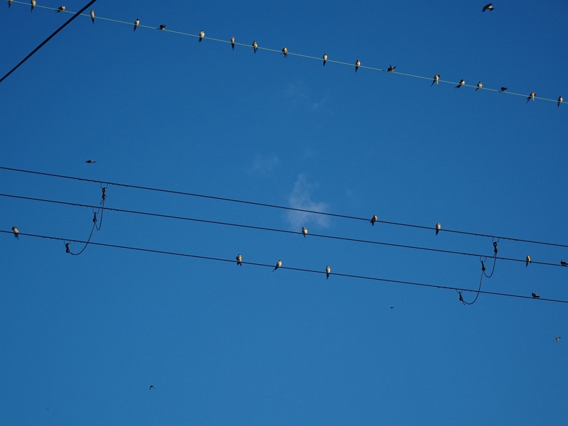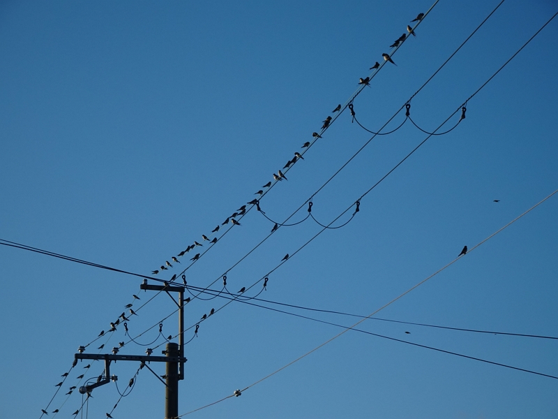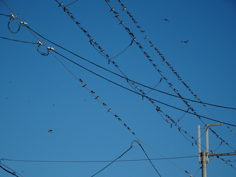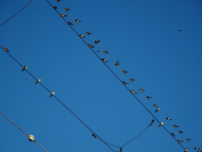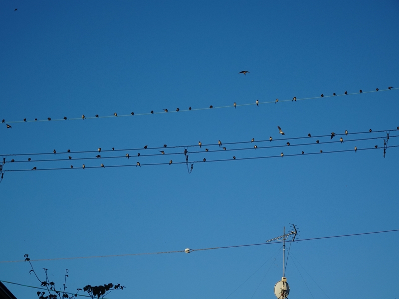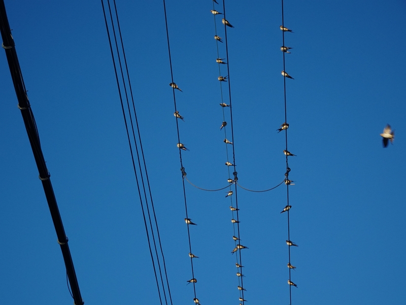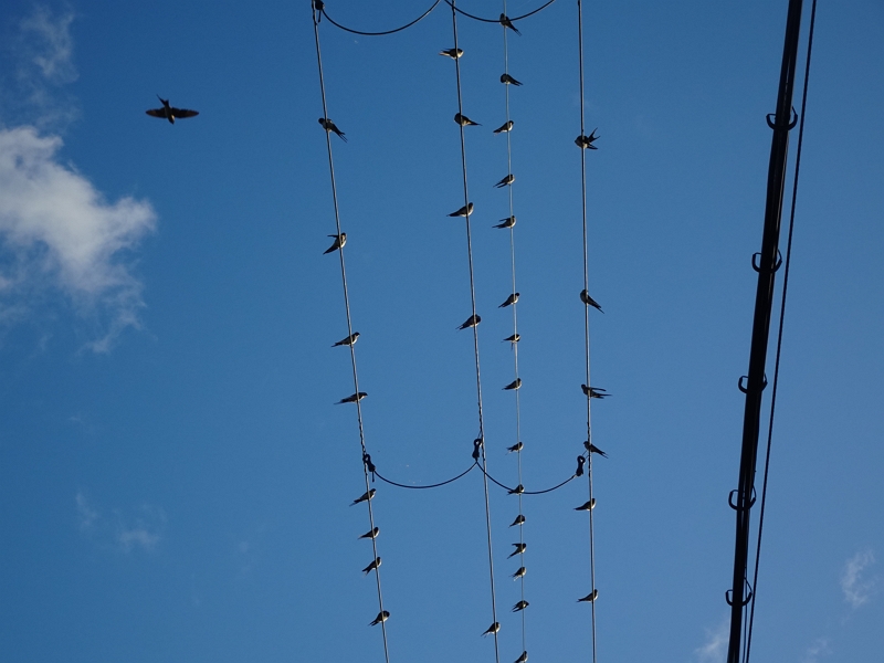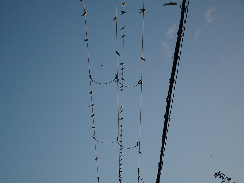 「今年はまだツバメがいるんだ!」と話しながら朝の散歩をつづけていると…!?驚きです。電線と空一面に無数のツバメたちの大群。その数…百?二百?数百?いや千オーバー?すごい数のツバメです。