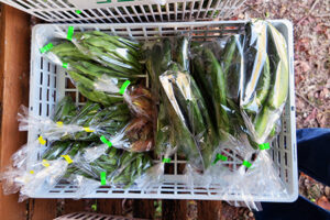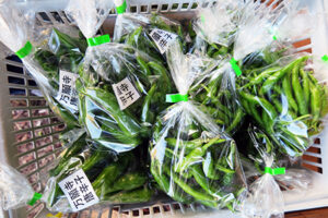 100円:ナス22・青ナス6袋、万願寺16袋、ゴーヤ5個、小松菜7袋、オクラ7袋、ピーマン8袋、トウガラシ10個、キュウリ8袋、豆3袋、ネギ16袋