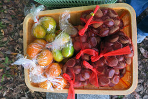 200円:ジャガイモ14袋、ミカン5袋、柿3袋、トウガン1個