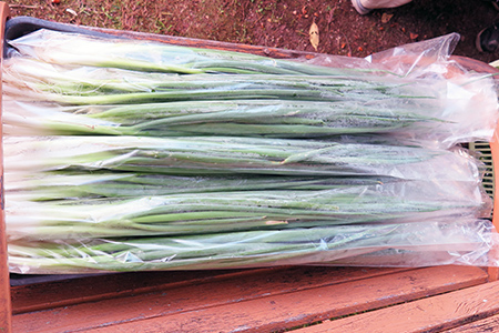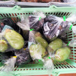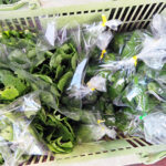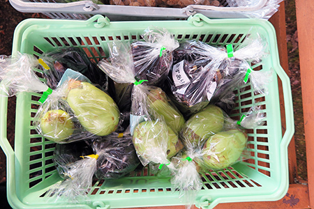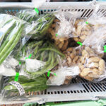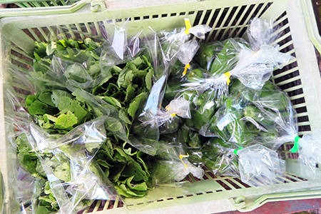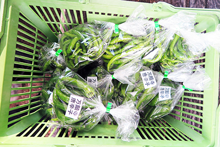 100円:万願寺6袋、ナス(・青ナス)20袋、ネギ26袋、ピーマン8袋、ゴーヤ3個、大根葉5袋、トウガラシ18袋、豆7袋