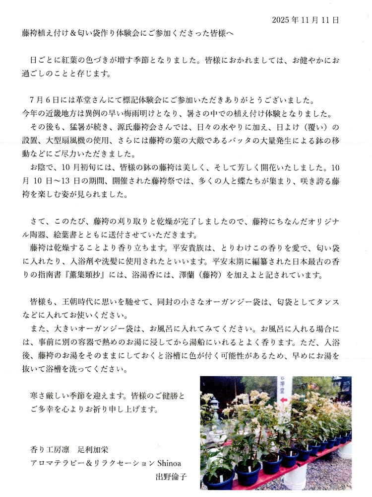 体験会を主催した事務局から、藤袴の匂い袋と入浴剤などが届きました。(04:以下同封の礼状兼案内文より)