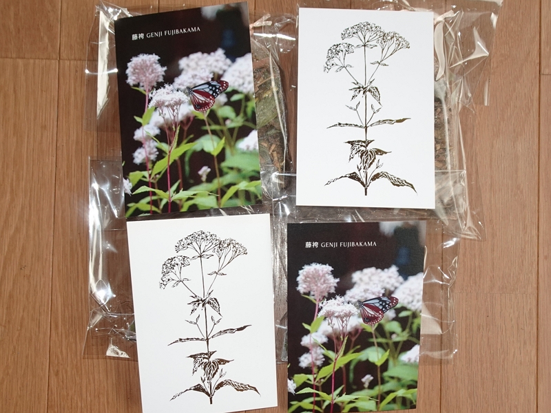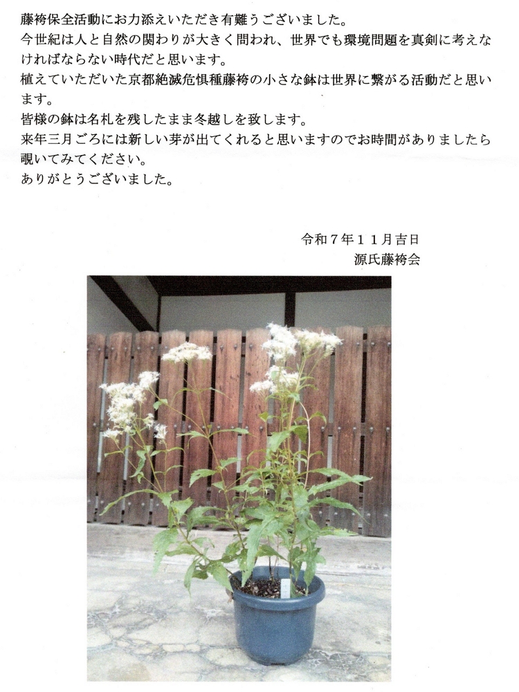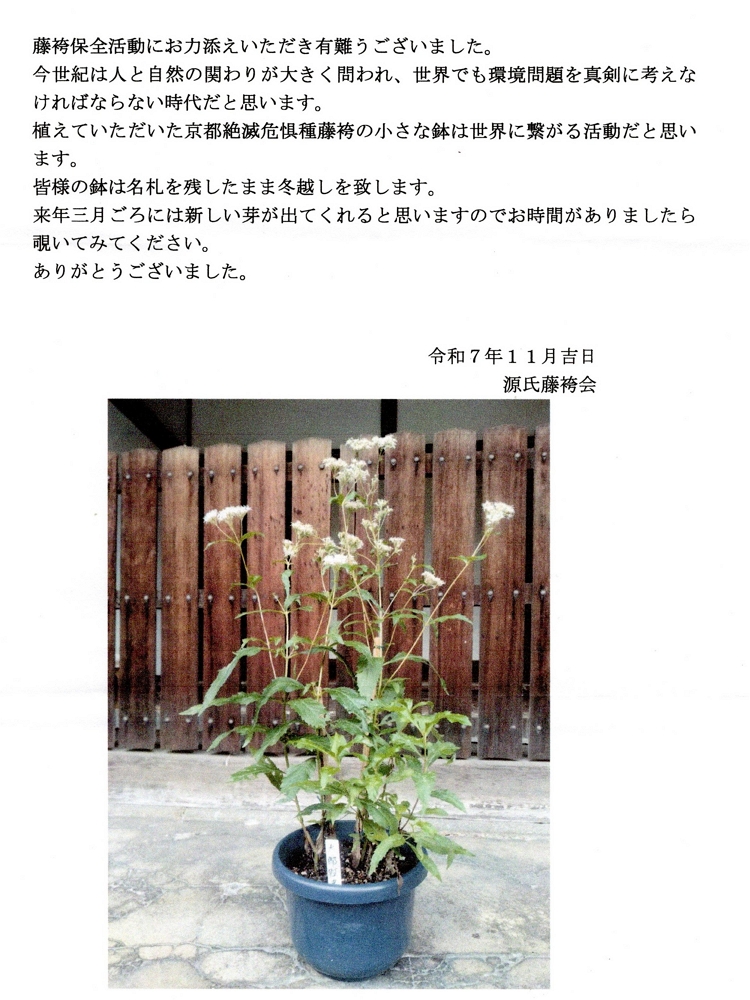 さて、このたび、藤袴の刈り取りと乾燥が完了しましたので、藤袴にちなんだオリジナル陶器(13)絵葉書(14)とともに送付させていただきます。