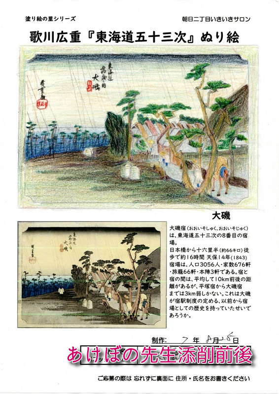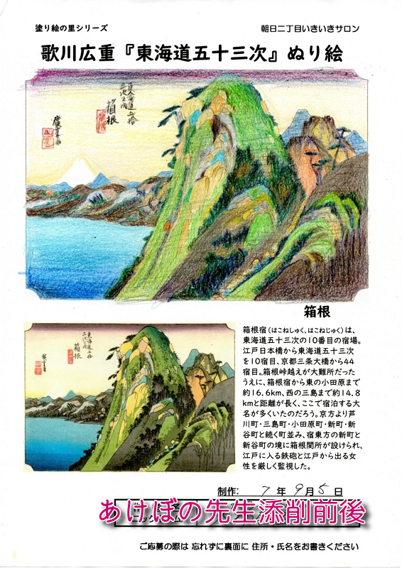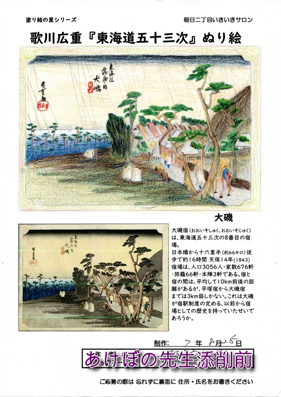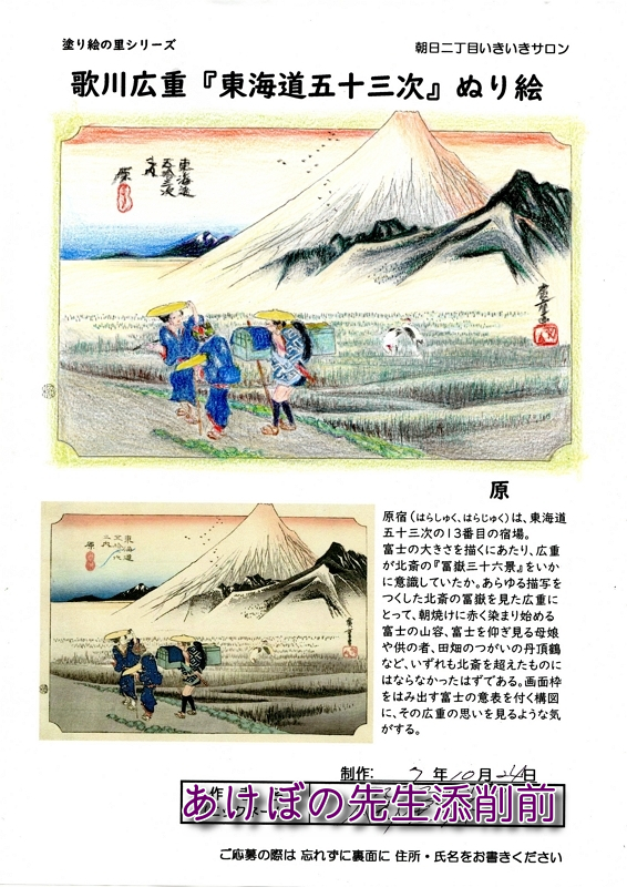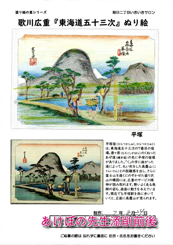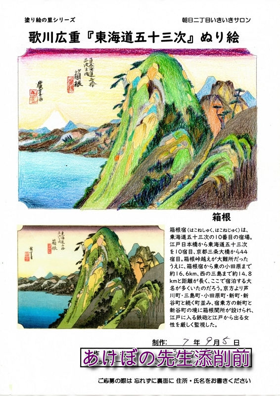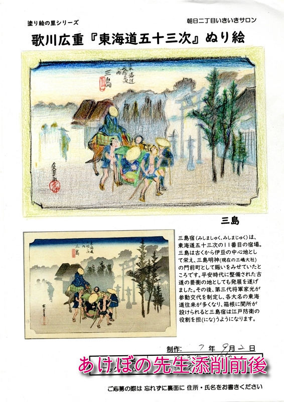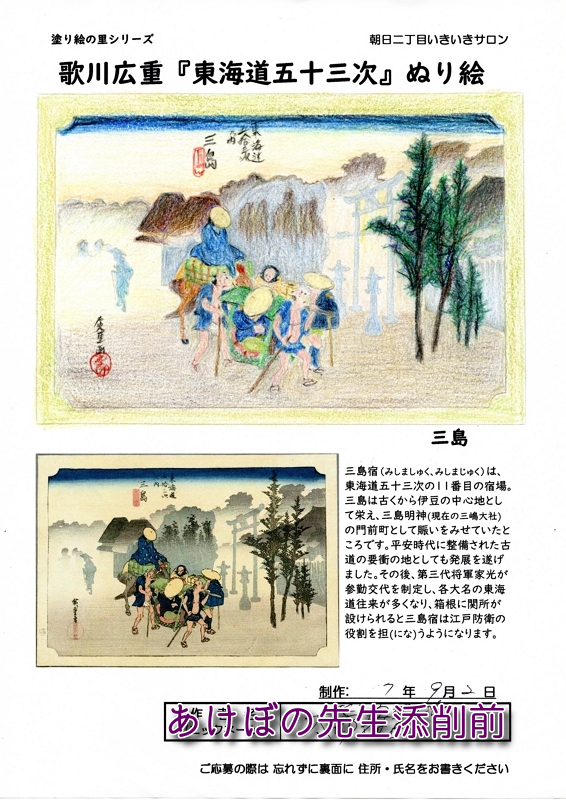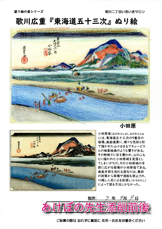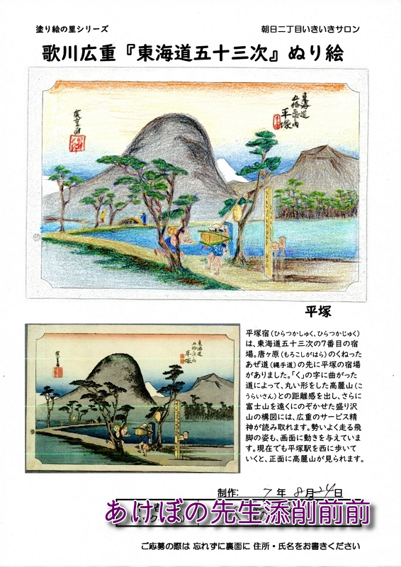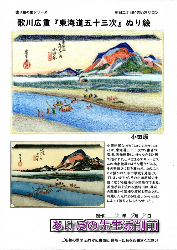 さて、ぬり絵入門コースでは、現在歌川広重の『東海道五十三次』