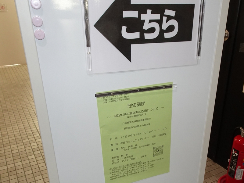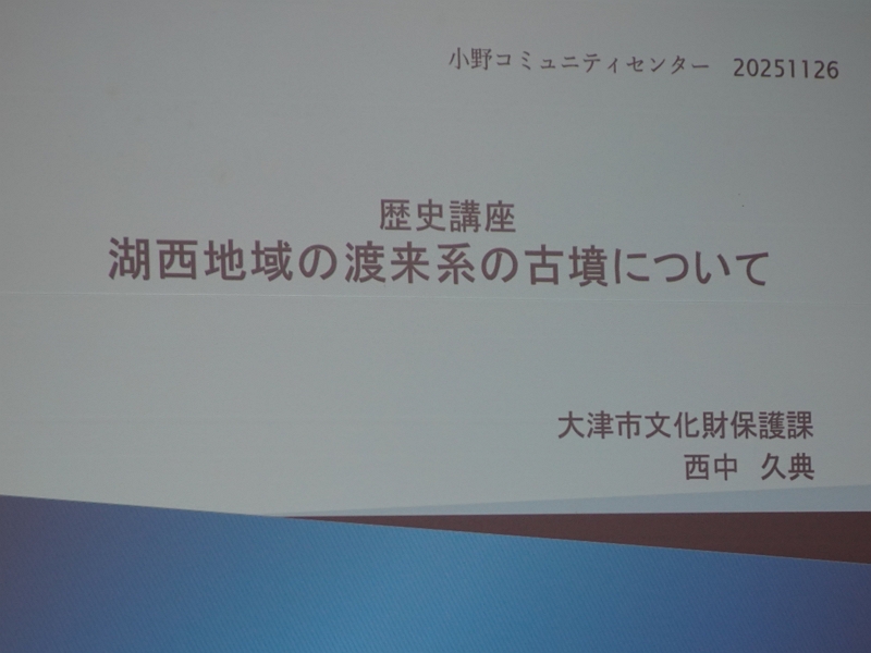 11月26日(水)10:00~11:30小野コミュニティセンター1階大会議室で歴史講座『湖西地域の渡来系の古墳について』坂本~錦織にかけて、が開催されました。