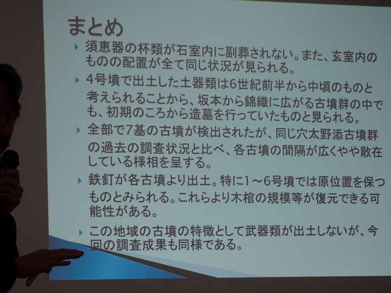 講師は、昨年同様西中久典氏(大津市市民部文化財保護課主査)です。穴太野添古墳群発掘事例紹介と曼荼羅山古墳群との違いは…時間いっぱいまで、時間が経つのを忘れるほど興味深く聞き入りました。(講座のレジュメは添付のpdfをご覧ください)