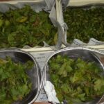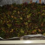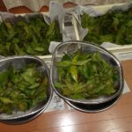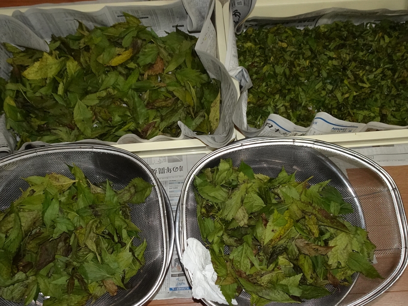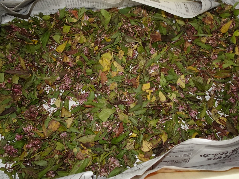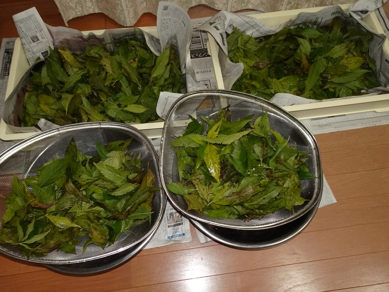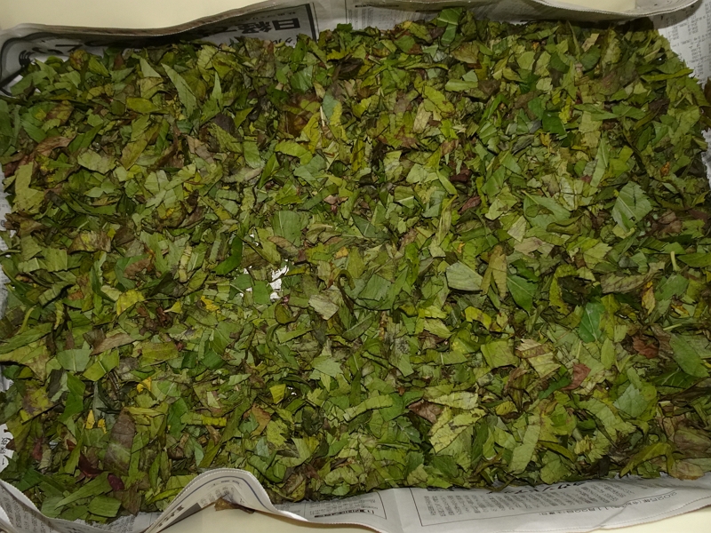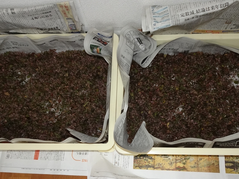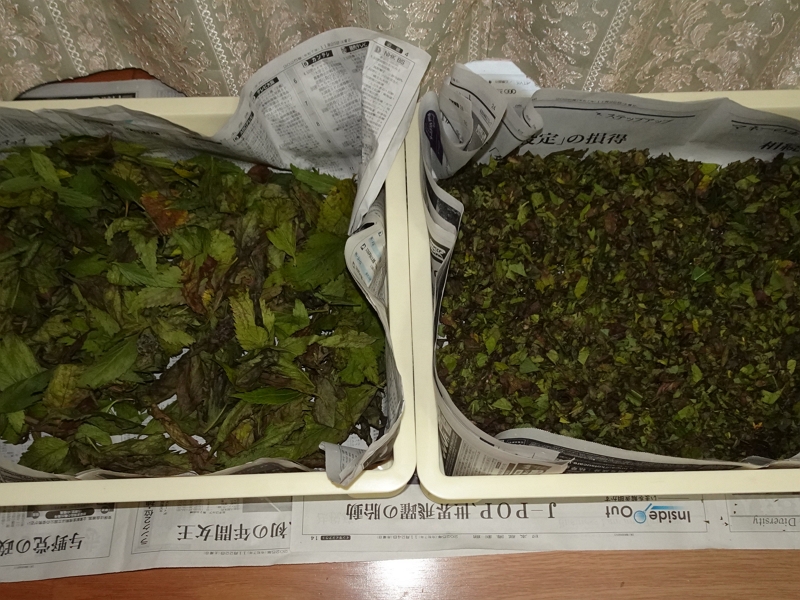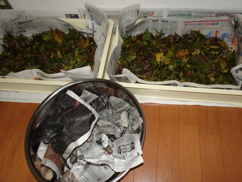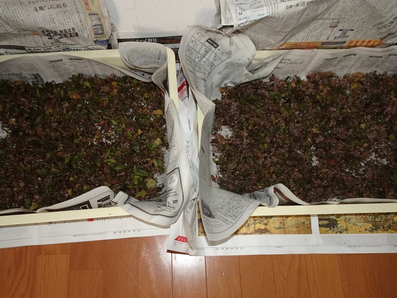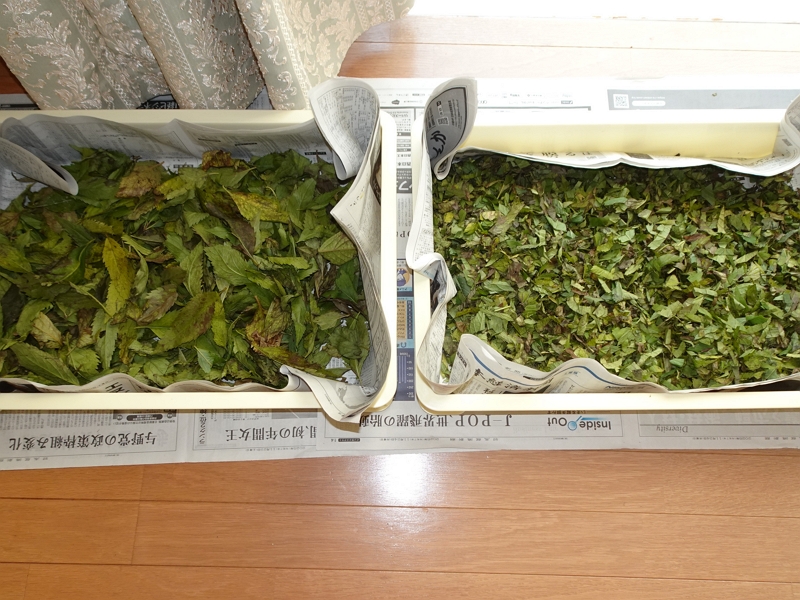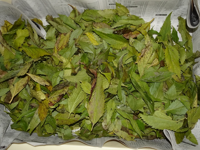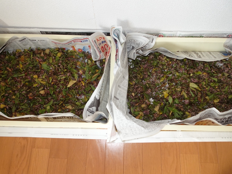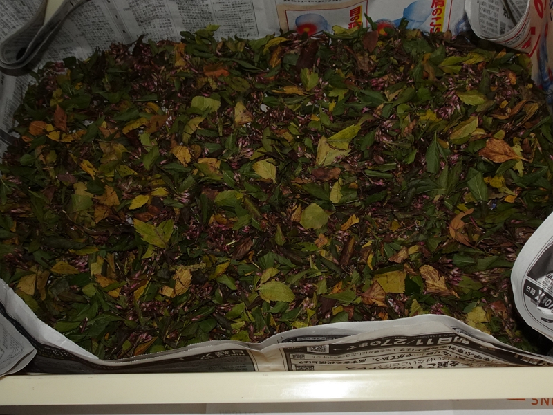 しばらくは、敷いている新聞紙を交換、10~20mmに再裁断を繰り返しながら乾燥を続けます(31~35)。フジバカマⅠは触れると少しガサガサと乾燥が進んでいる音がしますが、Ⅱの方はまだまだしっとり感が残っています。