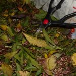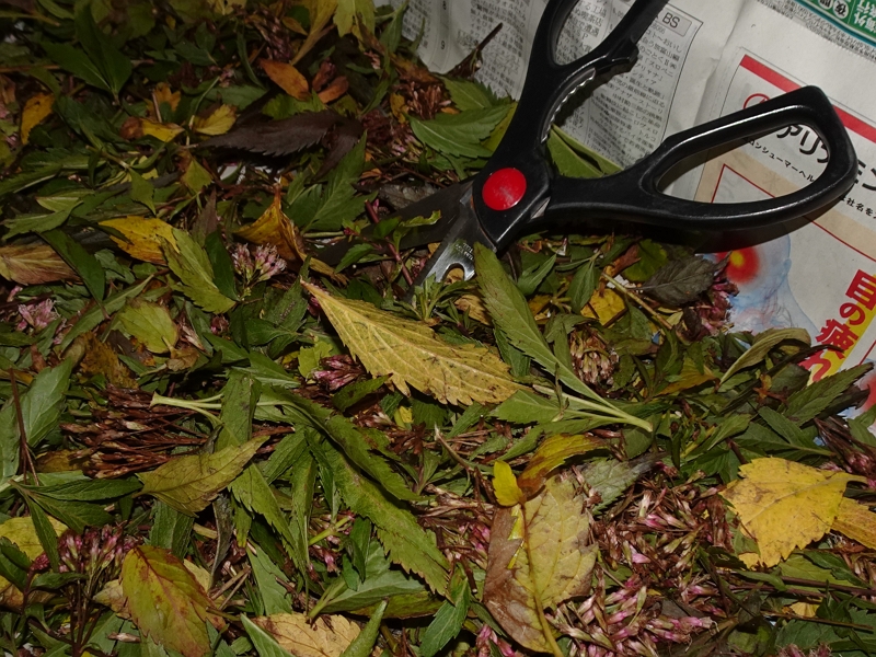 11月23日(日)、アサギマダラ殿の13人で、ソメイヨシノ公園にあるフジバカマ迎蝶園のフジバカマの刈取り作業をしました。その刈り取った枝を、ゴミ袋に詰めて、参加者が持ち帰り、乾燥させて『匂袋』『入浴剤』作りにチャレンジをしています(pdf)。